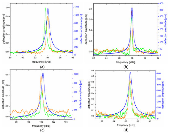 The resonance effect is depicted as a function of the deflection vs. the frequency, measured for the probes: (a) 1, (b) 4, (c) 5, and (d) 6. The left-handed, black y-axis refers to the deflection amplitude of Brownian motions, and the right-handed, blue y-axis refers to the amplitude of deflection induced by the generator. The green resonance curve refers to the Brownian motion of the AFM microcantilevers before ZnO deposition; the orange resonance curve refers to the Brownian motions of the AFM microcantilevers with the ZnO component; and the blue resonance curve refers to the AFM microcantilevers’ oscillations stimulated by the external generator.