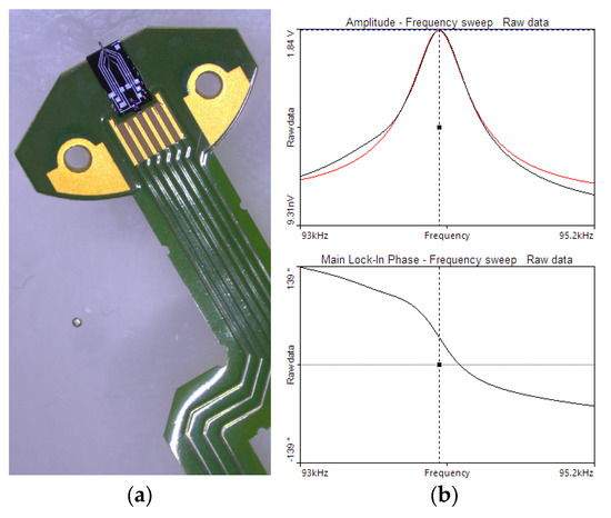 (a) The probe assembled on the dedicated flex-PCB; (b) the resonance curve measured inside the AFM system with the ZnO—NP actuation (black—measured, red—fitted).