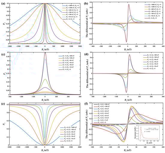 (a) Bz-Px relationship simulation under different Bx; (b) dispersion response of Bz under different Bx; (c) Bz-Px relationship simulation under different By; (d) dispersion response of Bz under different By; (e) Bx-Px relationship simulation under different Bz; (f) dispersion response of Bx under different Bz (the lower-right graph displayed the maximum fitting accuracy of Bx response slope).