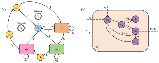where Q denotes a finite set of states and Σ denotes a finite set of input events. The state transition function δ: Q × Σ → Q defines how the FSM transitions between states based on input events. Specifically, for a given state and input event, the FSM moves to a new state determined by δ. is the initial state, from which the FSM starts to process input events. is the set of final states, which are states that, once reached, prevent further input events from being processed by the FSM. In this paper, FSM can be represented as: