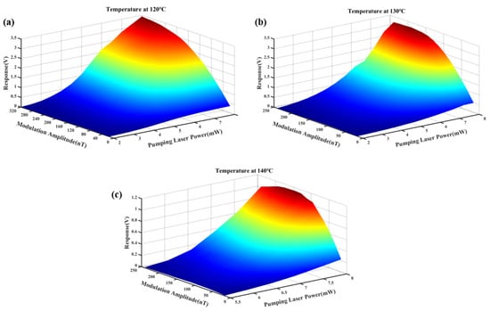 To achieve optimal sensitivity in the SERF-based magnetometer following the magnetic compensation process described above, key parameters such as temperature, pumping laser power, and modulation magnetic field amplitude had to be optimized []. In this paper, we studied the combined effects of the pumping laser power and modulation amplitude on the response of the SERF-based magnetometer at three operating temperatures: 120 °C, 130 °C, and 140 °C, as illustrated in Figure 6.