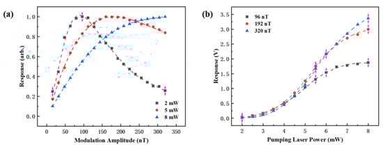 To further investigate the relationship between the pumping laser power and modulation magnetic field amplitude, the magnetometer response data obtained at 120 °C were analyzed in greater detail. Specifically, the effect of the modulation magnetic field amplitude on the magnetometer response was extracted at three different incident pumping laser powers (2 mW, 5 mW, and 8 mW), as shown in Figure 7a. For consistency and ease of comparison, the response amplitudes were normalized.