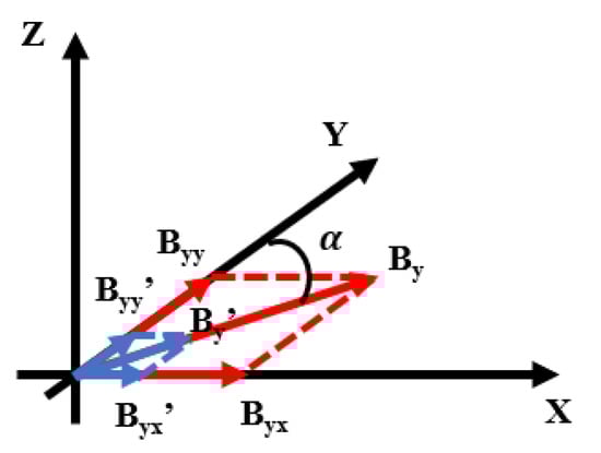 A non-orthogonal schematic diagram of the magnetic field coil between x-axis and y-axis. If there was a deviation of between the actual position and the ideal position of y-axis coil, Byy was the magnetic field projected By in the y-direction, and Byx was the magnetic field projected by By in the x-direction; Byy′ was the magnetic field projected By′ in the y-direction, and Byx′ was the magnetic field projected by By′ in the x-direction.