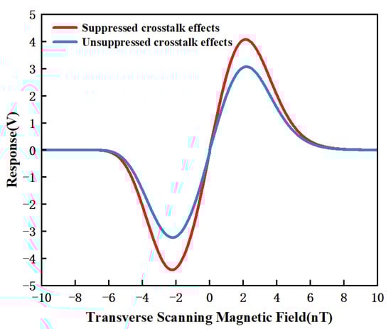 The presence of remanent magnetic fields reduced the slope of the dispersion curve’s linear region, thereby degrading the sensitivity of the SERF-based magnetometer []. To evaluate the effectiveness of the proposed FSM-IOMCA method in suppressing crosstalk, we conducted a comparative experiment under a 1 Hz triangular wave signal, where the “suppressed crosstalk effects” utilized the FSM-IOMCA method proposed in this paper, while the “unsuppressed crosstalk effects” employed a fixed initial step size l and error threshold E over three cycles. The experimental results are shown in Figure 9, indicating that the proposed FSM-IOMCA method significantly suppressed crosstalk, effectively reducing the introduction of unnecessary magnetic fields on non-target axes during the compensation process and thereby improving the overall sensitivity of the magnetometer.