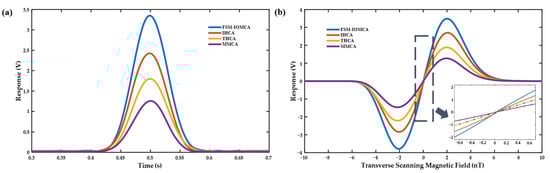 To evaluate the performance of four magnetic field compensation methods—FSM-IOMCA, IHCA, THCA, and MMCA—we evaluated them under consistent experimental conditions, using the previously optimized temperature, pumping laser power, and modulation magnetic field amplitude. A 1 Hz triangular wave signal was applied to scan the magnetic field, and the results are presented in Figure 10a. All four curves exhibited Lorentzian absorption line shapes, confirming that the magnetometer operated in the SERF regime. Figure 10b presents the corresponding dispersion curves obtained through LIA demodulation of the magnetometer output signals. In the near-zero magnetic field range, the dispersion curves were approximately linear response. Based on the slope of the dispersion curves, the magneto-voltage conversion ratios for the MMCA, THCA, IHCA, and FSM-IOMCA methods were calculated to be 1.02 V/nT, 1.49 V/nT, 2.12 V/nT, and 2.77 V/nT, respectively. These results clearly demonstrated that the FSM-IOMCA method achieved the highest signal response and compensation accuracy among the four methods, demonstrating its superior performance in enhancing the sensitivity of the SERF-based magnetometer.