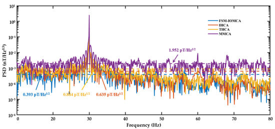 PSD of SERF-based magnetometer’s responses under four compensation methods: FSM-IOMCA (blue line), IHCA (orange line), THCA (yellow line), and MMCA (purple line). A calibration magnetic field signal of 2.5 nTrms in 30 Hz was utilized.