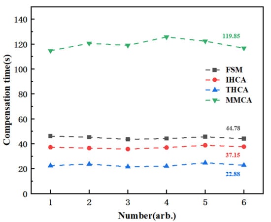 Compensation speeds of four magnetic compensation methods: FSM-IOMCA (44.78 s), IHCA (37.15 s), THCA (22.88 s), and MMCA (119.85 s).