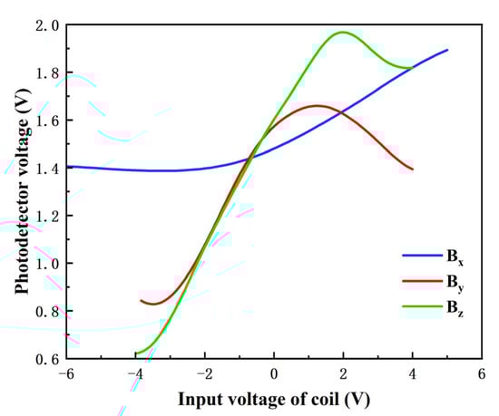 To determine the remanent magnetic field in the system, a ± 6 V voltage (corresponding to ±120 mA current) was applied to each axis of the three-axis compensation coil, and the photodetector signals PPD were recorded accordingly. As shown in Figure 13, when the input voltage to the x-axis coil was approximately −3.168 V (corresponding to −63.36 mA), the scanning curve reached its minimum value. For the y- and z-axes coils, the scanning curves reached their maximum values at approximately 1.228 V (corresponding to 24.56 mA) and 2.020 V (corresponding to 40.4 mA), respectively.