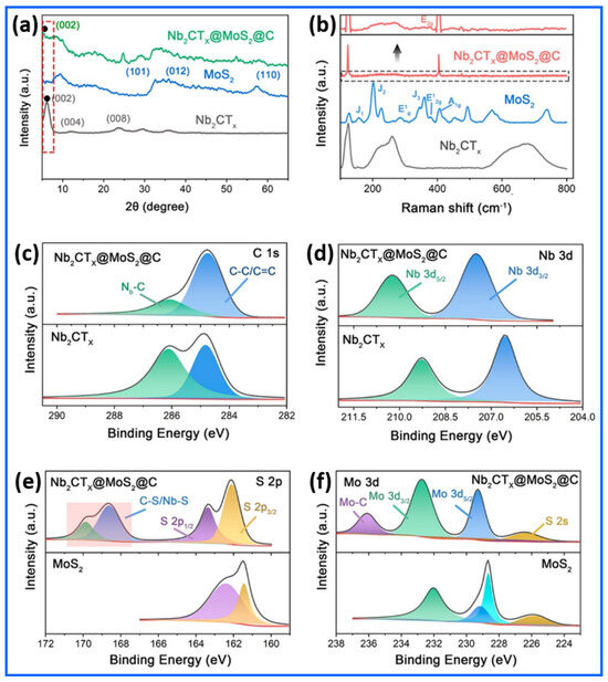 Structural and compositional characterizations of the Nb2CTx@MoS2@C hybrid. (a) X-ray diffraction (XRD) patterns and (b) Raman spectra of Nb2CTx@MoS2@C, MoS2, and Nb2CTx, confirming successful hybrid formation and a distinct phase composition. X-ray photoelectron spectroscopy (XPS) spectra of the Nb2CTx@MoS2@C hybrid. (c) C 1s spectrum indicating a carbonaceous element, (d) Nb 3d spectrum verifying the presence and oxidation state of niobium, (e) S 2p spectrum confirming the incorporation of MoS2, and (f) Mo 3d spectrum showing the chemical states of molybdenum. Reproduced with permission from Ref. [78]. Copyright (2021) American Chemical Society.