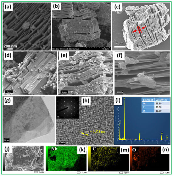 (a) The scanning electron microscopy (SEM) image of Nb2CTx MXene depicts a characteristic accordion-like, multilayered structure that forms after the selective etching of Nb2AlC. This morphology, resulting from the removal of Al layers, provides an expanded interlayer spacing, enhances the surface area, and facilitates an efficient charge transfer. The layered configuration is crucial for its function as a conductive substrate and cocatalyst in the hierarchical CdS@Nb2O5/Nb2CTx heterojunction. Reproduced with permission from Ref. [79]. Copyright (2023) American Chemical Society. (b) SEM image of Nb2CTx MXene after the selective Al etching process on the Nb2AlC MAX phase. The inset image of a block section reveals more extensive details, demonstrating the essential separation and looseness of Nb2CTx MXene layers, which facilitate the effective intercalation of alkali ions. Reproduced with permission from Ref. [80]. Copyright (2021) American Chemical Society. (c) SEM image of Nb2CTx MXene obtained after HF etching of the parent Nb2AlC MAX phase. The partially interconnected lamellae suggest the presence of structural defects or a non-uniform Al distribution. Reproduced with permission from Ref. [81]. Copyright (2020) Elsevier. (d) FESEM image of Nb2AlC showing the compact layered structure of the MAX phase. (e,f) FESEM images of Nb2CTx illustrating the expanded, exfoliated layered morphology following Al removal. (g) HRTEM image of few-layered Nb2CTx nanosheets. (h) High-resolution TEM image of Nb2CTx with an interplanar spacing of 0.374 nm (inset shows the SAED pattern with sixfold symmetry, confirming crystalline order). (i) EDX spectrum of Nb2CTx MXene confirming the presence of Nb, C, and O. (j) Selected area of Nb2CTx FESEM image and corresponding elemental mapping images for Nb (k), C (m), and O (n) demonstrating a uniform elemental distribution across the Nb2CTx MXene. Reproduced with permission from Ref. [82]. Copyright (2024) Wiley-VCH GmbH.