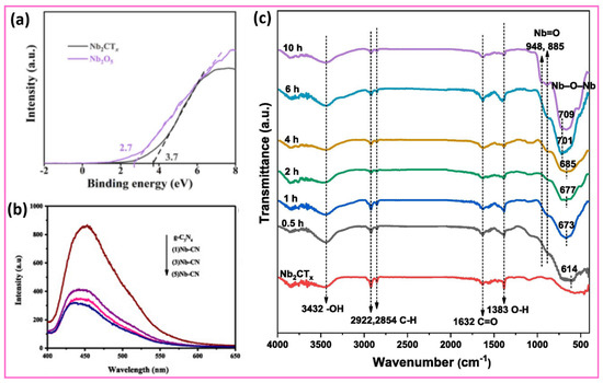 (a) Ultraviolet photoelectron spectroscopy (UPS) valence-band spectra of Nb2CTx MXene and Nb2O5, showing VBM values of 3.7 eV and 2.7 eV, respectively. Reproduced with permission from Ref. [85]. Copyright (2023) Elsevier. (b) Photoluminescence (PL) spectra of pristine g-C3N4 (CN) and its composites with varying loadings of Nb2CTx MXene (1 wt%, 3 wt%, and 5 wt%), denoted as (1)Nb–CN, (3)Nb–CN, and (5)Nb–CN, respectively. Reproduced with permission from Ref. [86]. Copyright (2023) Elsevier. (c) FTIR spectra analysis of Nb2CTx and Nb2O5@Nb2CTx, revealing the changes in surface functional groups during the hierarchical heterostructure’s formation. Reproduced with permission from Ref. [87]. Copyright (2021) Elsevier.