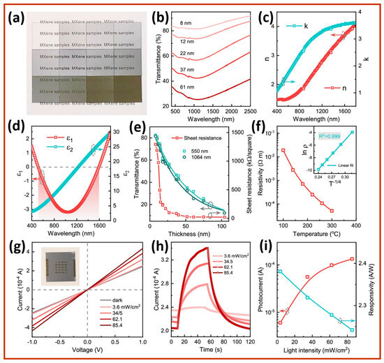 Optoelectronic characterization of Nb2CTx MXene thin films for NIR photodetection. (a) Optical images of films with thicknesses from 8 to 61 nm. (b) UV–Vis–NIR spectra showing broad absorption with a peak at 1100 nm. (c) Ellipsometry of an 86 nm film reveals the refractive index (n) and extinction coefficient (k). (d) Real (ε1) and imaginary (ε2) parts of dielectric permittivity, with ε1 negative from 520–1590 nm, indicating plasmonic behavior. (e) Thickness-dependent sheet resistance and transmittance at 550 nm and 1064 nm. (f) Temperature-dependent resistivity showing non-metallic behavior. (g) I-V curves under varying 1064 nm laser intensities. (h) Temporal photoresponse with prolonged rise/decay times (>40 s/20 s) due to trap-dependent transport. (i) Photocurrent and responsivity (up to 2.3 A/W), limited by high dark current and low on/off ratio. Reproduced with permission from Ref. [90]. Copyright (2022) American Chemical Society.