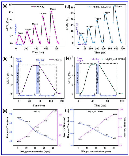 Comprehensive evaluation of the NO2 gas sensing performance of pristine Nb2CTx MXene and APTES-functionalized Nb2CTx-0.2 APTES MXene at room temperature. (a,d) Dynamic response profiles (5–25 ppm NO2) reveal a significantly enhanced sensitivity for the functionalized sensor (31.52%) compared to the pristine Nb2CTx MXene sensor (12.5%, attributed to the amine functional groups and the increased surface area). (b,e) Response–recovery kinetics at 5 ppm demonstrate faster adsorption and desorption in the functionalized Nb2CTx-0.2 APTES sensor, confirming improved interfacial charge transfer. (c,f) Response and recovery times decrease with higher NO2 levels, with consistently superior performance from the functionalized Nb2CTx-0.2 APTES sensor. Reproduced with permission from Ref. [99]. Copyright (2022) Royal Society of Chemistry.