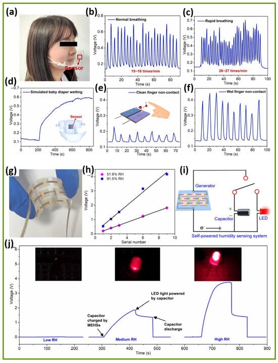 This demonstrates the versatile applications of the Nb2CTx/HA-based primary battery humidity sensor (PBHS). (a–f) The integration of the PBHS into a commercial face mask enables the real-time monitoring of respiration. Steady voltage oscillations are observed at a rate of 15–16 breaths per minute during normal breathing. At a faster pace of 26–27 breaths per minute, the PBHS device successfully demonstrates proper voltage response patterns. During diaper wetting, the PBHS achieves a stable voltage of 0.6 V, showcasing its effectiveness for innovative hygiene monitoring applications. A dry finger engages in non-contact detection and results in moderate voltage fluctuations near the PBHS until the finger is removed. The detection system generates higher voltage outputs from wet fingers, suggesting potential applications in hygienic touchless switching. Reproduced with permission from Ref. [104]. Copyright (2023) Elsevier. Furthermore, a self-powered humidity sensing system is realized through the Nb2CTx MXene/SA composite-based MEHS array. (g) The 3 × 3 MEHS array is depicted in the image; (h) demonstrates that voltage output increases as additional devices are connected in series, (i) includes a circuit diagram of the MEHS array combined with a capacitor and an LED, and (j) presents visual humidity detection across low, medium, and high RH levels, with varying LED brightness levels indicating humidity without external power. Reproduced with permission from Ref. [105]. Copyright (2022) Elsevier.