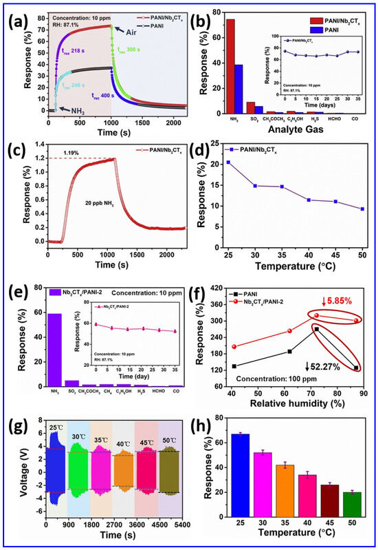 Figure 8a–d assesses all the essential features, including dynamic performance, selectivity, stability, ultra-low concentration detection, and temperature dependence of the PANI/Nb2CTx MXene for NH3 sensor for practical applications in exhaled human breath under high-humidity conditions [109]. Figure 8a compares the dynamic response of PANI and PANI/Nb2CTx MXene sensors when measuring 10 ppm NH3 at 87.1% RH. The PANI/Nb2CTx MXene sensor shows response and recovery times surpassing PANI alone. The rapid response and recovery kinetics for NH3 adsorption/desorption under humid conditions are due to the controlled morphology of PANI nanofibers influenced by the synergistic effects of Nb2CTx MXene nanosheets. The PANI/Nb2CTx MXene sensor demonstrates exceptional selectivity for detecting NH3, as shown in Figure 8b, because it exhibits a better response to NH3 under various interfering gases such as CH4, C2H5OH, C3H6O, H2, and CO. This unique selectivity capability of the PANI/Nb2CTx MXene sensor is crucial for the sensor, particularly in real-world environments containing various volatile compounds found in exhaled breath and industrial facilities. The strong chemical bond between the surface functional groups (–OH, –O) of Nb2CTx MXene sensor nanosheets and NH3 molecules, coupled with the p-n heterostructuring of the PANI/Nb2CTx MXene sensor nanocomposite, enhances its selectivity for NH3 detection while minimizing cross-interactions with other vapor molecules. The inset of Figure 8b demonstrates that the PANI/Nb2CTx MXene sensor exhibits excellent stability during operation, showing a minimal variation of less than 11% over 35 days. Figure 8c illustrates that the PANI/Nb2CTx MXene sensor exhibits a high sensitivity to NH3 detection at very low concentrations of 20 ppb while operating at 87.1% RH. The PANI/Nb2CTx MXene sensor’s functionality at 20 ppb NH3 concentrations makes early medical diagnosis possible through breath analysis, aiding in chronic kidney disease screening and environmental monitoring. The hierarchical porous structure, combined with a high surface area in the composite, provides many active sites for interaction with gases, thus enabling an enhanced sensitivity at low concentrations. Figure 8d evaluates the performance of the PANI/Nb2CTx MXene sensor under various operational temperatures, ranging from 25 to 50 °C. It is observed that the PANI/Nb2CTx MXene sensor’s response mechanism decreases with increasing operating temperatures. The PANI/Nb2CTx MXene sensor’s response diminishes because higher temperatures accelerate desorption processes, which results in limited overall adsorption, consequently leading to a reduced sensor response. The response–performance relationship based on temperature underscores the necessity of temperature monitoring in practical breath analysis, as the temperature of exhaled breath varies with environmental factors and states of human health. Additionally, the Nb2CTx MXene/PANI-2 sensor demonstrates ammonia gas sensing capabilities, enhancing industrial and workplace safety, as illustrated in Figure 8e–h [110]. Figure 8e highlights the remarkable selectivity of the Nb2CTx MXene/PANI-2 sensor towards ammonia (NH3) at an 87.1% relative humidity (RH). When exposed to 10 ppm NH3, the Nb2CTx MXene/PANI-2 sensor’s response was significantly higher than its response to other interfering gases, including SO2, CH3COCH3, CH4, CH3OH, H2S, and HCHO. Notably, the response to NH3 was at least 11.79 times greater than that to any other tested gas, underscoring its high specificity for ammonia detection. This exceptional selectivity can be attributed to the synergistic sensing properties of PANI, which possesses an inherent selectivity towards NH3, and the MXene (Nb2CTx) component with abundant surface terminations that strongly interact with NH3 molecules. Furthermore, the inset of Figure 8e demonstrates the Nb2CTx MXene/PANI-2 sensor’s long-term stability, maintaining 89% of its initial response over 35 days under humid conditions (87.1% RH). Figure 8f illustrates the effect of varying humidity levels on the NH3 sensing response of pure PANI and the Nb2CTx MXene/PANI-2 sensor at 100 ppm. Within the typical humidity range (41.0–87.1% RH), both sensors exhibited an initial increase in response as humidity increased, likely due to the hygroscopic nature of NH3 promoting its adsorption. However, at a very high humidity (87.1% RH), the response began to decline, indicating that water molecules occupy active adsorption sites, thus hindering NH3 adsorption. Notably, the Nb2CTx MXene/PANI-2 sensor showed a significantly lower sensitivity loss at high humidity than pure PANI. The response attenuation of the Nb2CTx MXene/PANI-2 sensor was 8.94 times lower than that of the PANI sensor, which can be attributed to the formation of intermolecular hydrogen bonds between PANI and Nb2CTx MXene. These bonds effectively occupy water adsorption sites, mitigating the adverse effects of humidity and enhancing the sensor’s robustness in humid environments. Figure 8g examines the dynamic response and recovery behavior of the Nb2CTx MXene/PANI-2 sensor at various temperatures (25–50 °C) under 87.1% RH while detecting 10 ppm NH3. The results reveal a clear trend; as the temperature increases, the Nb2CTx MXene/PANI-2 sensor’s voltage response decreases. This inverse relationship can be attributed to the desorption dynamics of NH3 at higher temperatures, leading to a reduction in the number of adsorbed molecules on the Nb2CTx MXene/PANI-2 sensor’s surface. Despite this decline, the Nb2CTx MXene/PANI-2 sensor still exhibits an appreciable responsiveness even at 50 °C, maintaining a significant response of around 20%. Such resilience indicates that the Nb2CTx MXene/PANI-2 sensor can operate effectively across practical temperatures, making it suitable for breath monitoring (typically around 34–37 °C) and agricultural ammonia detection. Finally, Figure