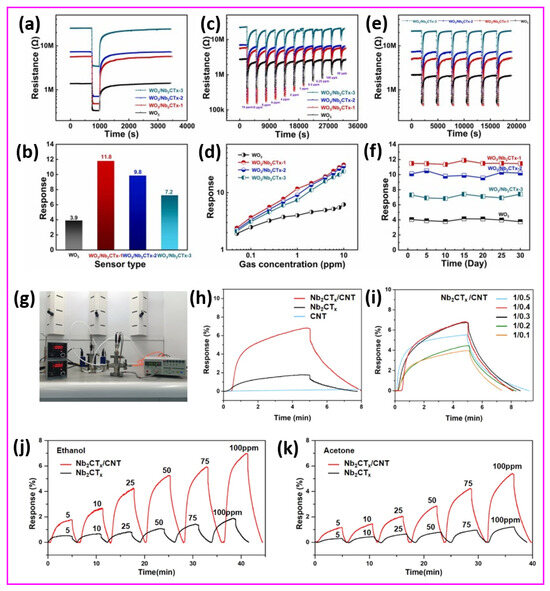 The acetone gas sensing responses of sensors fabricated using WO3, WO3/Nb2CTx-1, WO3/Nb2CTx-2, and WO3/Nb2CTx-3. (a) The resistance of sensors showed a dynamic change when exposed to 1 ppm acetone vapor at 200 °C, (b) selective response values of different sensors at 1 ppm acetone, (c) dynamic resistance measurement was monitored at different acetone concentration levels from 50 ppb to 10 ppm, (d) the response values vs. acetone concentration, (e) cyclic stability assessment under repeated exposure to 1 ppm acetone, and (f) long-term stability evaluation of the sensors over 30 days at 200 °C. Reproduced with permission from Ref. [114]. Copyright (2021) Elsevier. (g) A photograph shows the VOC sensing setup featuring mass flow controllers (MFCs), a gas chamber, and a data acquisition (DAQ) system. (h) The hybrid material Nb2CTx/CNT achieved a better sensitivity than Nb2CTx and CNT-based sensors after exposure to 100 ppm ethanol vapors. (i) The Nb2CTx/CNT sensor exhibited its best performance for detecting 100 ppm ethanol when having a 1:0.4 ratio between Nb2CTx and CNT. (j) Pristine Nb2CTx and Nb2CTx/CNT hybrids demonstrated a better sensitivity and linear response over different ethanol concentration ranges from 5 to 100 ppm during evaluation. (k) The acetone detection performance of Nb2CTx and Nb2CTx/CNT hybrid sensors over different acetone concentration ranges from 5 to 100 ppm. Reproduced with permission from Ref. [115]. Copyright (2024) American Chemical Society.