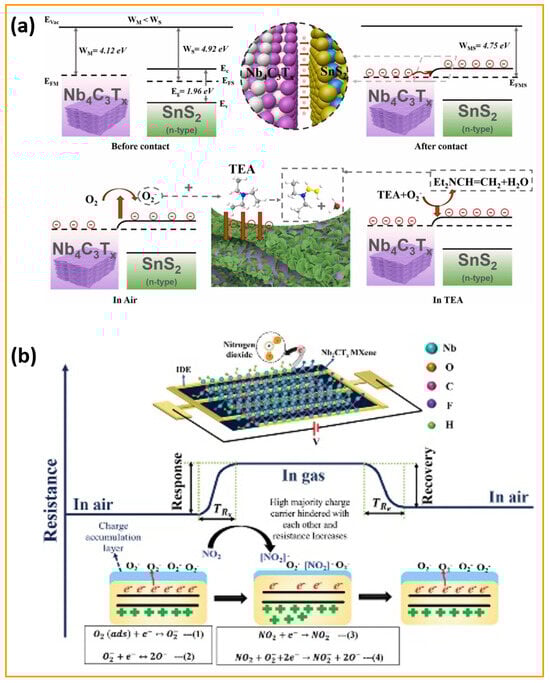 (a) Schematic illustration of the gas sensing mechanism of the SnS2/Nb4C3Tx composite toward triethylamine (TEA). The mechanism involves a charge transfer from Nb4C3Tx to SnS2 due to differences in work function, the formation of surface-bound O2− species in air, and subsequent redox reactions with TEA that release electrons, reduce the depletion layer, and lower sensor resistance, resulting in a strong chemiresistive response at room temperature. Reproduced with permission from Ref. [100]. Copyright (2024) Elsevier. (b) Schematic illustration of the gas sensing mechanism of delaminated Nb2CTx MXene functionalized with cetyltrimethylammonium bromide (CTAB) for NO2 detection. Upon exposure to air, oxygen molecules are adsorbed on the Nb2CTx MXene surface and ionized into O2− species, forming an electron depletion layer by withdrawing electrons from the conduction band. When exposed to NO2 gas, an additional electron withdrawal occurs, leading to a further increase in resistance due to holes’ accumulation. The CTAB functionalization enhances interlayer spacing, surface area, and stability, enabling improved gas diffusion, selective adsorption, and reduced degradation under ambient conditions. The combination of surface functional groups (–O, –OH, –F), intercalated CTAB, and the metallic conductivity of Nb2CTx collectively contributes to the enhanced sensitivity and signal-to-noise ratio of the sensor. Reproduced with permission from Ref. [122]. Copyright (2022) Wiley-VCH GmbH.