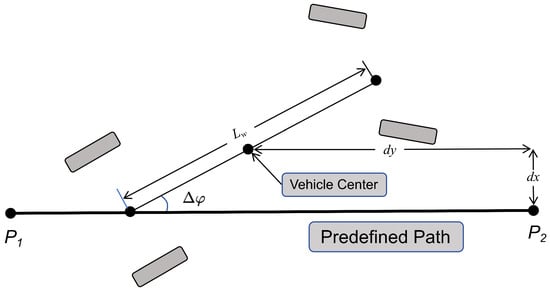 - and denote the directional deviations between the vehicle’s current position and reference path waypoint, as shown in Figure 1.