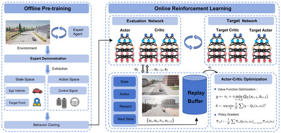 (1) Dual-Stage Learning Mechanism: This study introduces a supervised pre-training-RL dual-stage optimization mechanism, integrating expert knowledge-guided supervised pre-training with the Twin Delayed Deep Deterministic Policy Gradient (TD3) algorithm. During the supervised pre-training phase, BC is employed to optimize the controllability of initial policy gradient update directions, effectively mitigating the inherent sample efficiency limitations of RL algorithms. This approach significantly reduces the resource consumption and training time required for model development. In the online RL phase, the pre-trained policy is further refined through iterative interaction, which enhances the model’s performance ceiling and generalization capability across diverse scenarios.