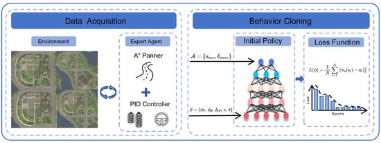 During the offline supervised learning phase, an expert agent is employed to collect a trajectory dataset within the target environment, capturing expert demonstrations for policy initialization. Subsequently, the initial policy network is trained via supervised learning using BC, enabling the acquisition of static mapping relationships inherent in the expert strategies [36].