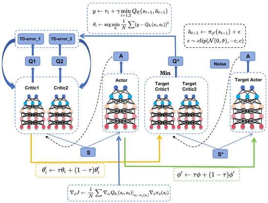 After completing offline supervised learning, the pre-trained policy is loaded, with two value networks initialized. Subsequently, the efficient TD3 algorithm [38] is adopted for policy updates. Specifically, it employs two independent critic networks and delayed updates for the actor network to mitigate issues such as Q-value overestimation and inherent, unstable policy updates. The architecture of the TD3-based algorithm in the proposed RL phase is illustrated in Figure 4.