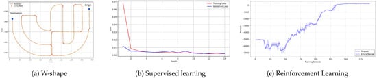 Training setup of the policy in the HSRL process. (a) W-shape route used for RL training. (b) Supervised learning curve. (c) RL curve.