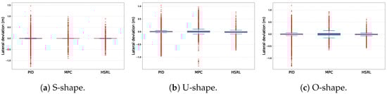 The path tracking comparison results are shown in Figure 7. In the simpler test scenario, the S-shape route Figure 6a, the error control performance of all three controllers is better than rest of test scenarios. Additionally, only the HSRL method was able to control the error within a relatively narrow range. With respect to low-error-range control, the PID and HSRL controllers exhibit similar effectiveness in precision tracking. In simple terms, the HSRL model outperformed the PID and MPC controllers in terms of tracking. The excellent tracking performance of the HSRL is due to the data-driven mechanism, which can directly learn the nonlinear dynamic characteristics of complex systems without relying on precise mathematical models, making it highly adaptable.