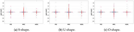 To measure the performance of three controllers in reducing passengers’ MS, jerking and the MSDV were considered simultaneously. The experimental results of jerking are shown in Figure 8, and the MSDV comparison results are shown in Figure 9.