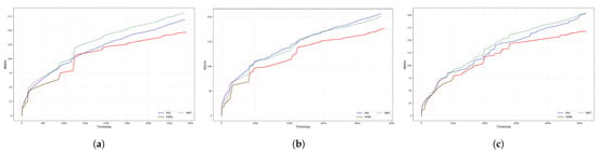 MSDV comparison results in three different routes. (a), (b) and (c) show the cumulative values of MSDV over time for the vehicle in the S-shape, U-shape, and O-shape scenarios, respectively.