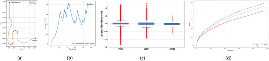 The high-speed performance evaluation was conducted under a unified reference speed profile, as shown in Figure 10b, which required rapid acceleration to peak speeds followed by deceleration before sharp turns. The test scenario (Figure 10a) included multiple curve points to test path tracking robustness. The PID, MPC, and the proposed HSRL were compared based on lateral deviation (Figure 10c) and the MSDV over time (Figure 10d).