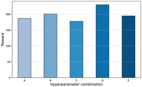 To investigate the impact of the reward weight hyperparameters on algorithm performance, a sensitivity analysis was conducted, as shown in Figure 11. The x-axis represents different parameter sets, with specific hyperparameter values detailed in Table 4. The y-axis indicates the corresponding reward scores for these parameter sets, representing the overall performance of the method. All subsequent experiments in this paper were implemented using the highest-scoring configuration, D.