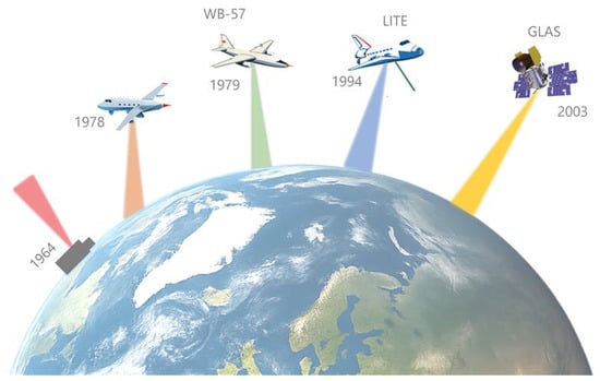 An artistic visualization of the evolution of LiDAR systems based on a deployment platform constructed for Earth exploration, with important milestones depicted inspired by []: 1964—the first ground-based LiDAR, atmospheric backscattering LiDAR located in at Lexington, Massachusetts []; 1979—the first high attitude airborne LiDAR mission on Wb-57 aircraft []; 1994—LITE experiment, the first spaceborne LiDAR (atmospheric backscattering), deployed on Space Shuttle Discovery []; 2003—GLAS, the first standalone spaceborne LiDAR [].
