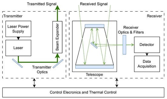 Figure 2 illustrates the high-level setup schematic of the spaceborne LiDAR instrument which consists of three main subsystems: transmitter, receiver, and control electronics + thermal control. The transmitter includes a laser light source and optical elements (such as mirrors, lenses, or beam expanders) used to shape, collimate, or split the beam. The optical receiver consists of a telescope that collects the backscattered photons from the target, spatial and spectral filters that select the desired wavelengths, and a photodetector. The designs and choice of these elements vary among systems and depend on the application. If the transmitter and receiver share optical elements, the setup is called monostatic; if they have separate paths, it is bistatic. For example, the CALIOP instrument onboard the CALIPSO satellite is a bistatic LiDAR, using two lasers aligned parallel to the receiving telescope [,].