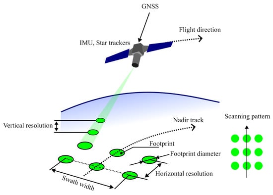 Measurement geometry of a spaceborne LiDAR system. The satellite platform has GNSS, IMU, and star trackers for precise geolocation. The emitted laser pulses generate footprints on the ground, defining the system’s horizontal and vertical resolution. The scanning pattern and swath width determine the spatial coverage of the measurements.