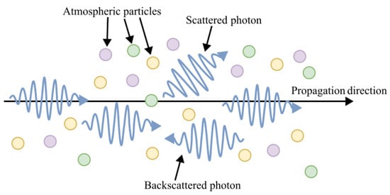 Scattering is a physical phenomenon that refers to the redirection of electromagnetic waves when they encounter particles or irregularities in their path. Backscattering, in particular, occurs when a portion of the scattered light is redirected back toward the source due to interactions with atmospheric molecules or aerosols. The intensity and nature of backscattering depend on a couple of factors, such as the wavelength of the laser, the size and composition of atmospheric particles, and the distance the laser pulse travels through the medium. An illustration of the scattering phenomenon is depicted in Figure 4 [,,,].