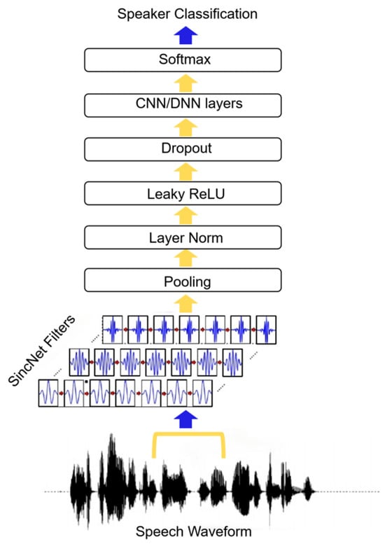 SincNet, introduced by Mirco Ravanelli and Yoshua Bengio [23], innovatively designs band-pass filters using parameterized Sinc functions, enabling each filter’s low and high cut-off frequencies to possess clear physical meanings. As shown in Figure 1, the architecture of SincNet offers significant advantages over traditional convolutional neural networks by reducing model parameters, enhancing computational efficiency and interpretability, and enabling precise feature extraction for specific frequency bands. Studies have demonstrated SincNet’s exceptional performance in speech recognition and short-time audio processing tasks, particularly in noisy environments where its ability to capture narrowband signals surpasses conventional CNN structures.