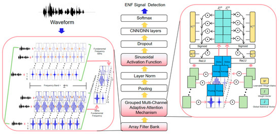 This architectural design not only fully integrates the physical characteristics and spectral structure of ENF signals but also proposes targeted solutions to the shortcomings of traditional methods. The overall architecture of the improved model is shown in Figure 2.