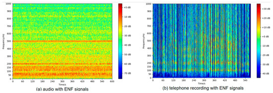 As shown in Figure 3, the spectral distribution of ENF in two typical scenarios is presented: Figure 3a shows the spectrum of ambient audio recorded using a mobile phone in an indoor setting in Wuhan, while Figure 3b illustrates the spectrum of call audio recorded via the built-in recording feature of a mobile phone during a conversation between Beijing and Wuhan. In Figure 3b, the 50 Hz fundamental frequency component of the ENF is no longer visible, although the high-frequency components remain detectable.