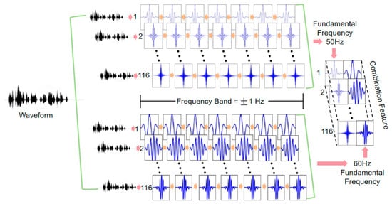 In this case, , where represents the fundamental frequency (either 50 Hz or 60 Hz), and denotes the harmonic order. For the first harmonic of a 50 Hz fundamental frequency (i.e., 50 Hz), the filter frequency range is . For the second harmonic (i.e., 100 Hz), the range is [99, 101] Hz, and similarly for subsequent harmonics. The same applies to a 60 Hz fundamental frequency. After processing by the array filter bank, the audio signal will yield two sets of features, each corresponding to the higher-order harmonic features of the 50 Hz and 60 Hz fundamental frequencies, respectively. The specific design is illustrated in Figure 4.