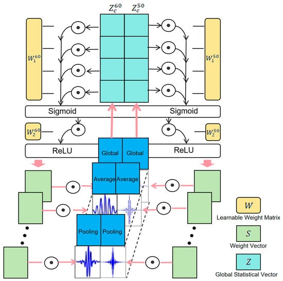 To perform channel attention calculation on the higher-order harmonic feature subgroups for the 50 Hz and 60 Hz fundamental frequencies, the first step is to compute the channel-level global statistical vector for each feature group through global average pooling, as shown in Equation (4):