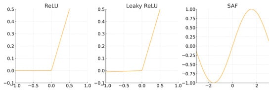 The mathematical expression for SAF is shown in Equation (9). Figure 6 presents the curve illustrations for Leaky ReLU, ReLU, and SAF.