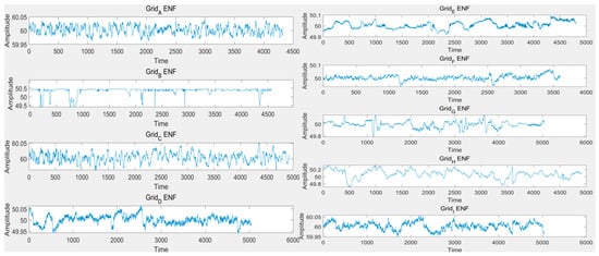 In previous research, we treated the ENF as a simple periodic signal, neglecting its inherent stochastic oscillatory characteristics. As shown in Figure 7, Zaman et al. [33] extracted ENF from nine different regions across various countries using MATLAB (R2025a). It can be observed that the oscillatory nature of ENF is intrinsic and exhibits significant spatiotemporal variability.