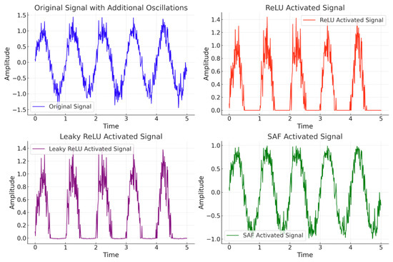 To further analyze the performance of different activation functions in processing power grid signals, we input a set of simulated periodic stochastic oscillatory signals into ReLU, Leaky ReLU, and SAF activation functions. As shown in Figure 8, compared to ReLU and Leaky ReLU, the periodic fluctuations and oscillatory behavior of the original signal are significantly preserved when processed through the SAF activation function.
