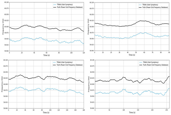 The detailed results are presented in Table 1, and Figure 9 visually illustrates the ENF trajectory matching curves for four randomly selected samples from the 12 audio clips. For clarity in comparison, the TRIAA signal is offset downward by 0.05 Hz in Figure 9. The data in Table 1 demonstrate that the ENF signals extracted from the 12 audio segments exhibit strong alignment with the corresponding records in the power grid frequency database, indicating high correlation. Figure 9 further highlights the close consistency between the extracted ENF trajectories and the reference signals.