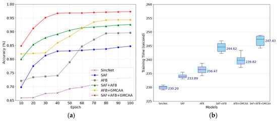 Figure 10a illustrates the accuracy evolution curves of each model configuration after 100 training epochs. The results demonstrate that all models incorporating the improved modules significantly outperform the baseline model in terms of accuracy. Notably, when SAF, AFB, and GMCAA are used in combination, the model achieves the highest accuracy of 97.3%, highlighting the substantial advantage of multi-module collaborative optimization in enhancing ENF detection accuracy.