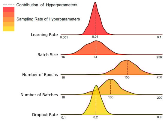 The experiment was conducted using the standardized A4 dataset, characterized by an audio length of 4 s, a fixed signal-to-noise ratio (SNR) of 10 dB, and no high-pass filtering. During the hyperparameter optimization process, Optuna performed multiple rounds of iterative sampling to evaluate key parameters, including learning rate, batch size, number of epochs, number of batches, and dropout rate. These parameters were automatically adjusted to explore their impact on model performance. As shown in Figure 11, the dashed lines represent the contribution of each hyperparameter to the improvement of model performance, while the color gradient from light to dark reflects the frequency of parameter sampling. This visualization demonstrates the extensive coverage and in-depth exploration of the search space during the optimization process.