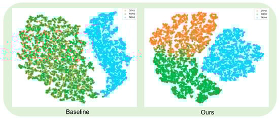 To further evaluate the model’s performance in fundamental frequency classification and the effectiveness of the frequency grouping strategy (GMCAA), this experiment employed the t-SNE (t-Distributed Stochastic Neighbor Embedding) visualization technique to intuitively illustrate the distribution of audio features corresponding to different fundamental frequencies (50 Hz and 60 Hz) within the model’s feature space. For a fair comparison, Conv-AttNet [21] was selected as the baseline model, and its performance was compared with that of our proposed model on the same dataset A4.