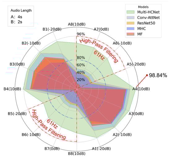 Figure 13 presents a radar chart illustrating the performance of the Multi-HCNet model under varying SNR, audio lengths, and high-pass filtering conditions. The chart in the upper left corner specifies two audio lengths: A for 4 s and B for 2 s. The chart in the upper right corner indicates the corresponding colors assigned to different baseline models and the proposed model. The radar chart displays the test performance across 16 datasets, named based on audio length, sequence number, and SNR. These 16 datasets are marked along the perimeter of the radar chart, representing diverse combinations of audio lengths, sequence numbers, and SNR conditions. The figure plots the test results of each model on their respective datasets. Notably, the red dashed line highlights datasets subjected to high-pass filtering, while the blue dashed line represents the 80% accuracy benchmark.