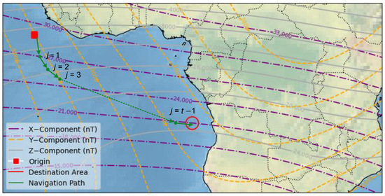 where is the geomagnetic field vector observed at the agent’s current position at step j, and is the target’s known geomagnetic signature. The condition defines the target proximity threshold, with as a small positive constant.