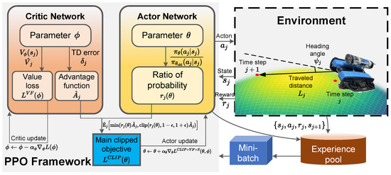 Proximal policy optimization (PPO) is a widely used DRL algorithm recognized for its balance between training stability and sample efficiency [30]. As an enhancement over earlier policy optimization methods, PPO introduces a clipped surrogate objective, which ensures more reliable and stable updates [31]. The structure of the PPO framework is shown in Figure 3.